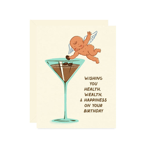 $ 6.50Birthday greeting card featuring a vintage inspired martini glass with a playful cupid illustration in soft retro tones. Text reads “Wishing You He...
