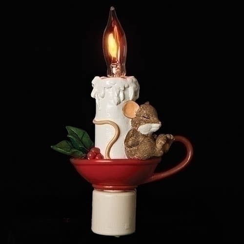 $ 25.007 h sleeping mouse night light flicker flame; w/swivel plug. Materials Description: Resin/glass. 7"H 4"W 2.5"D. Power Type Description: Plug-in.